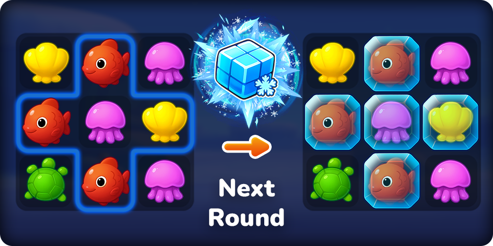 - Aktifkan skill untuk membersihkan 3 ubin secara acak dan ubin di sekitarnya, meninggalkan area berbentuk salib yang akan membekukan ubin selama giliran lawan Anda.