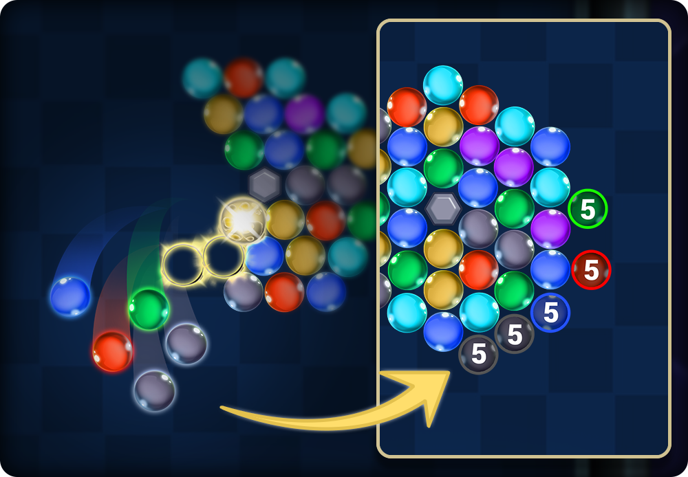 - 同じ色のバブルを3つ以上マッチさせて消し、バブルが壁に当たらないようにします。