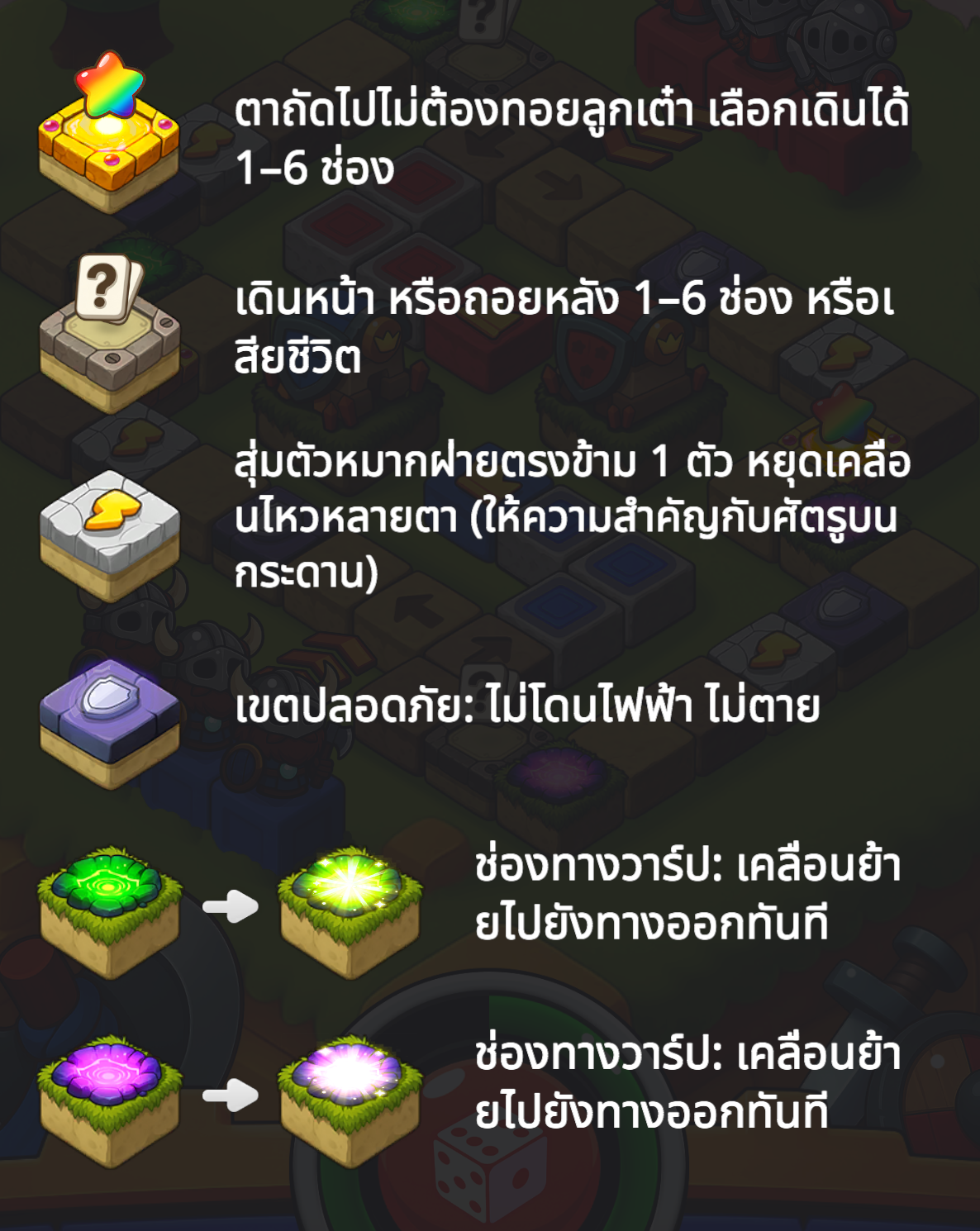 - ทอยลูกเต๋า 2 ลูก แล้วเลือก 1 ลูกเพื่อเคลื่อนย้ายตัวหมาก