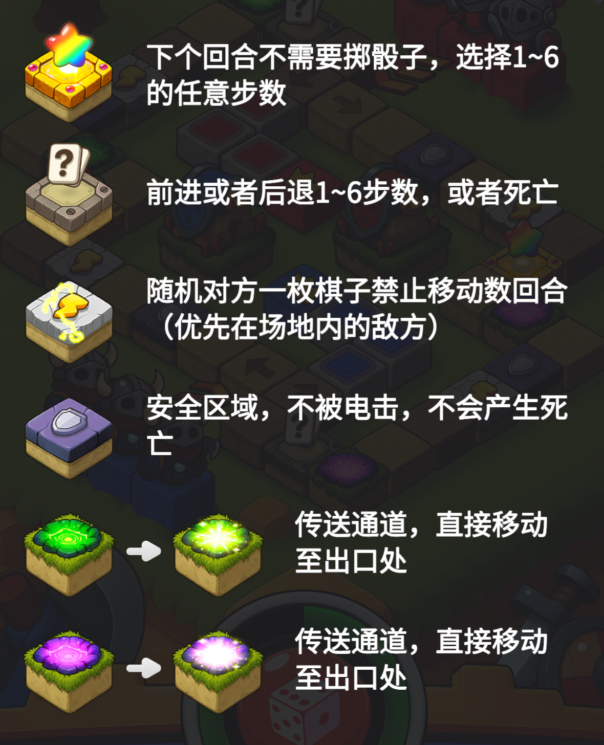 - 如果对方棋子落在你的棋子所在格子上,你将死亡(除非受到安全区域或叠加保护)。